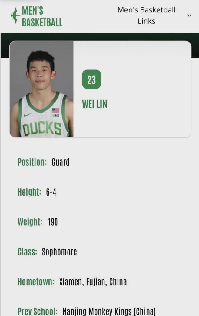 根据俄勒冈大学的注册信息显示,林葳的年级为大二,身披23号球衣,身高1米93,体重86公斤。