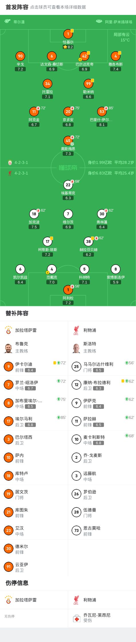第15分钟,索博斯洛伊送点,奥斯梅恩主罚命中,加拉塔萨雷主场1-0领先利物浦