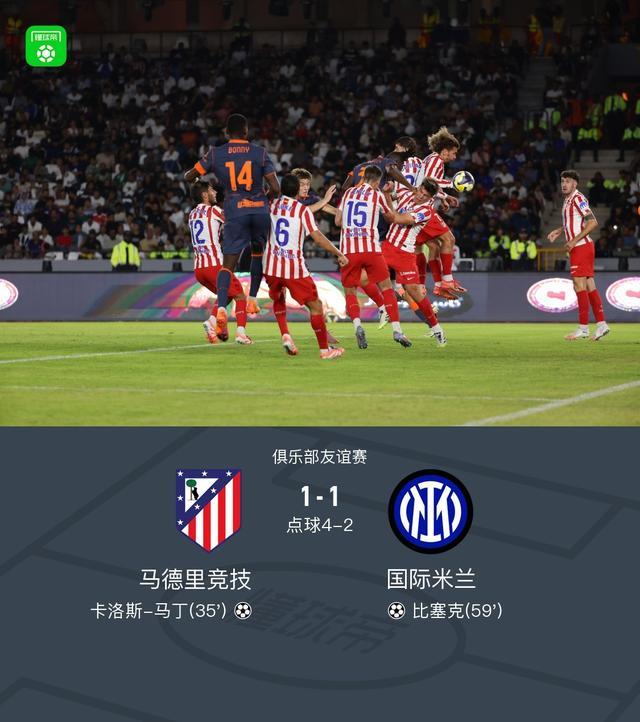 北京时间10月11日,一场俱乐部友谊赛在马德里竞技与国际米兰之间展开。上半场卡洛斯-马丁禁区内灵巧半转身后打近角得手。下半场姆希塔良开出角球,比塞克头球破门扳平比分。点球大战马竞4-2国米,总比分5-3取胜。