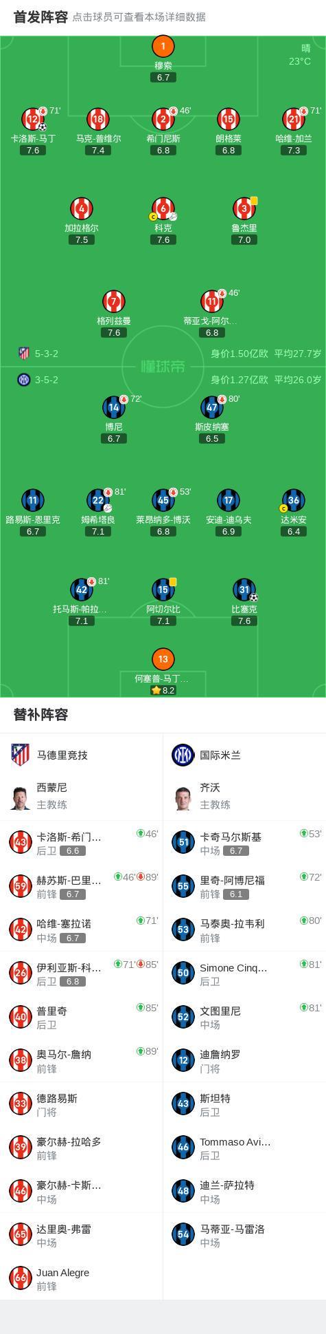 第59分钟,姆希塔良开出角球,比塞克头球破门,国米1-1马竞